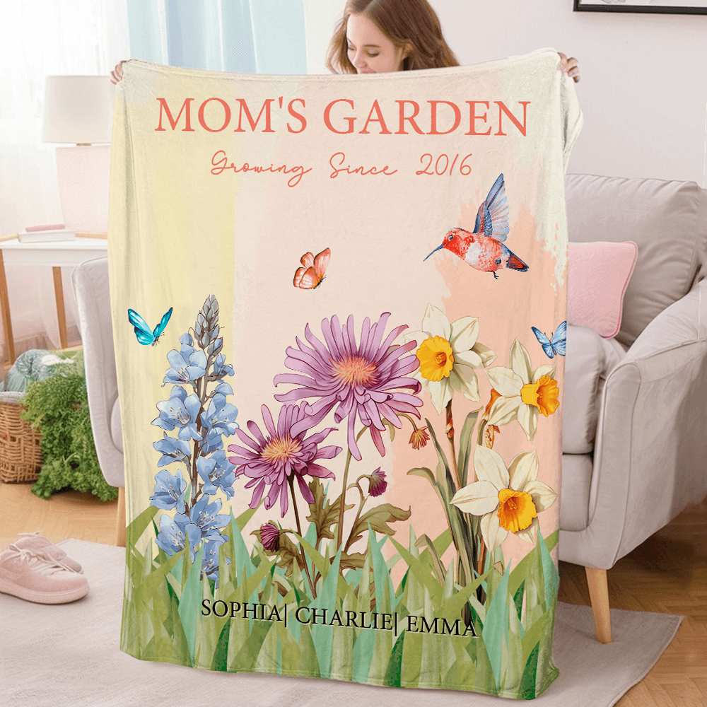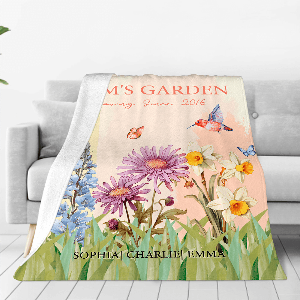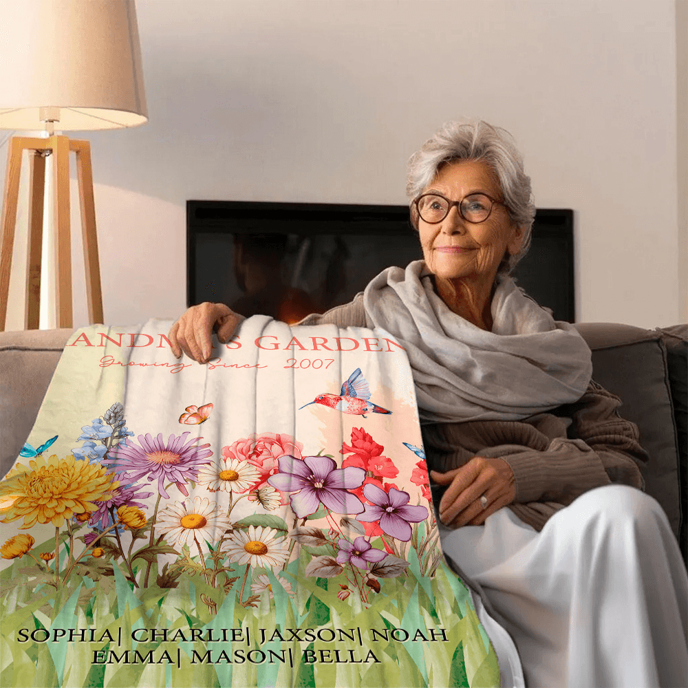 Personalized Design - This cozy blanket features beautiful birth flowers, along with custom names and a title such as “Mom's Garden” or “Grandma's Garden.” Each flower symbolizes a family member’s birthday, making it a meaningful addition to any home.