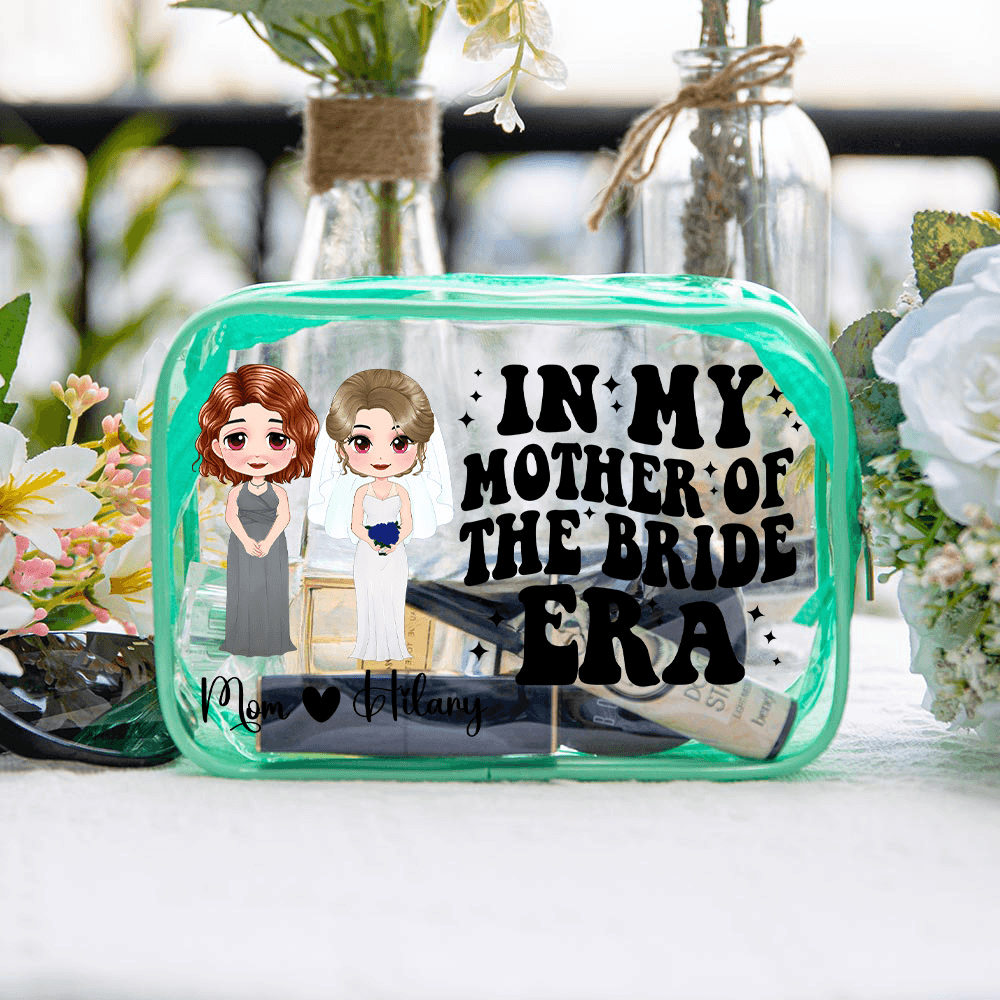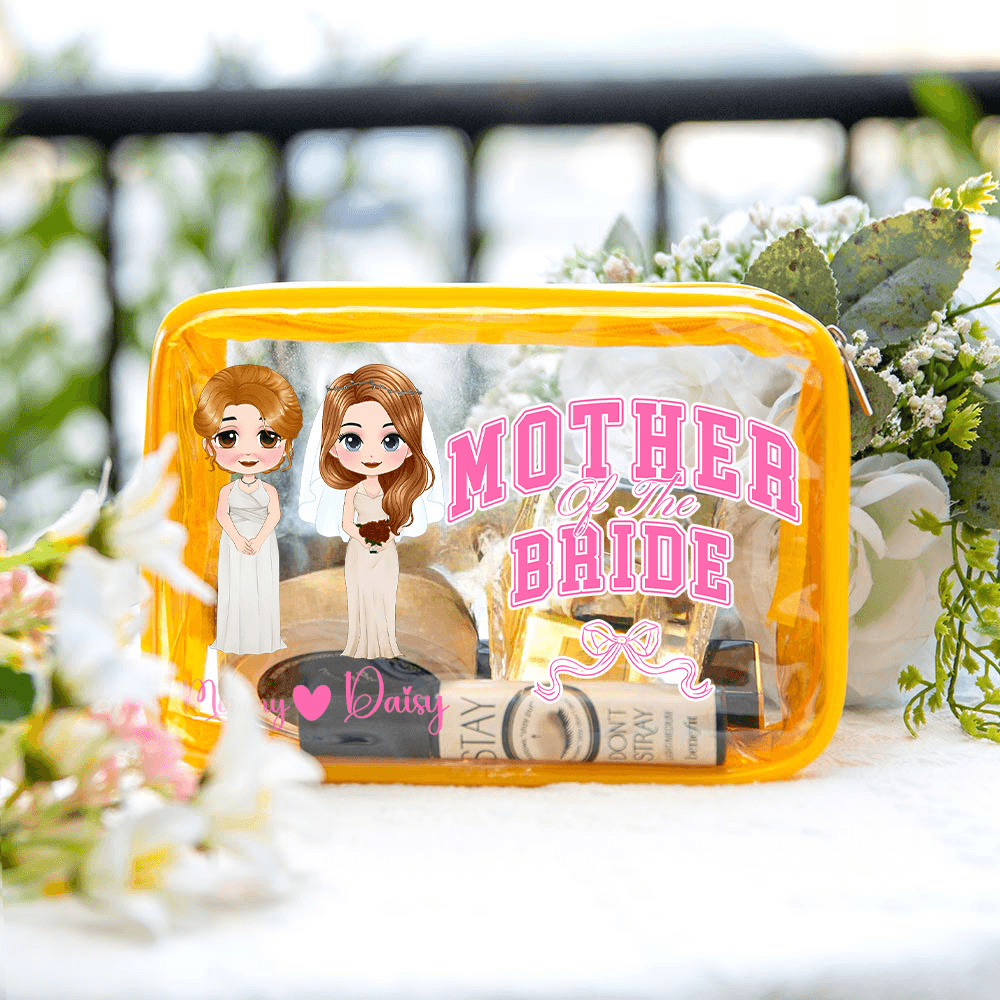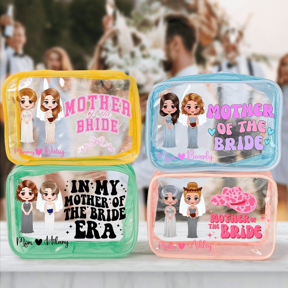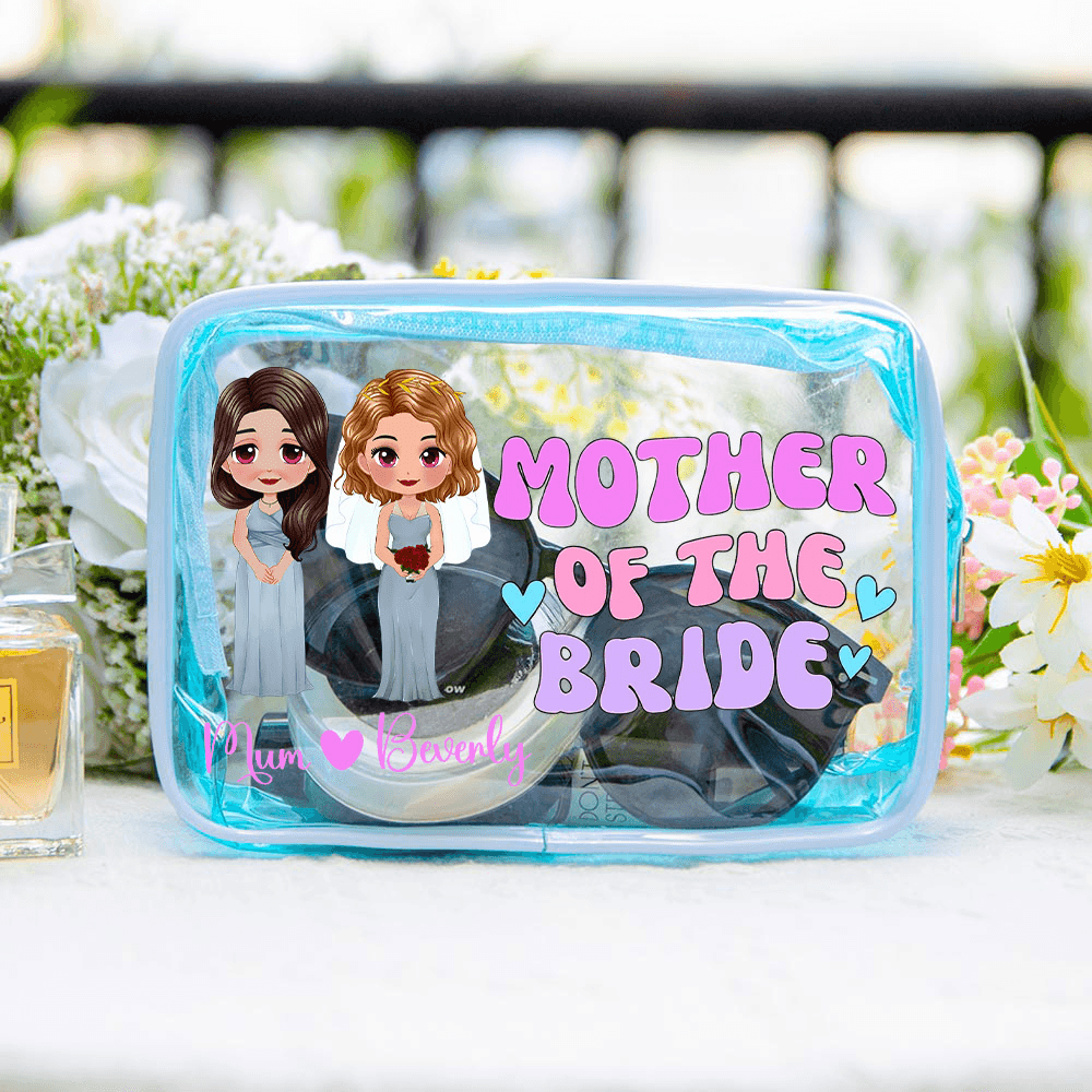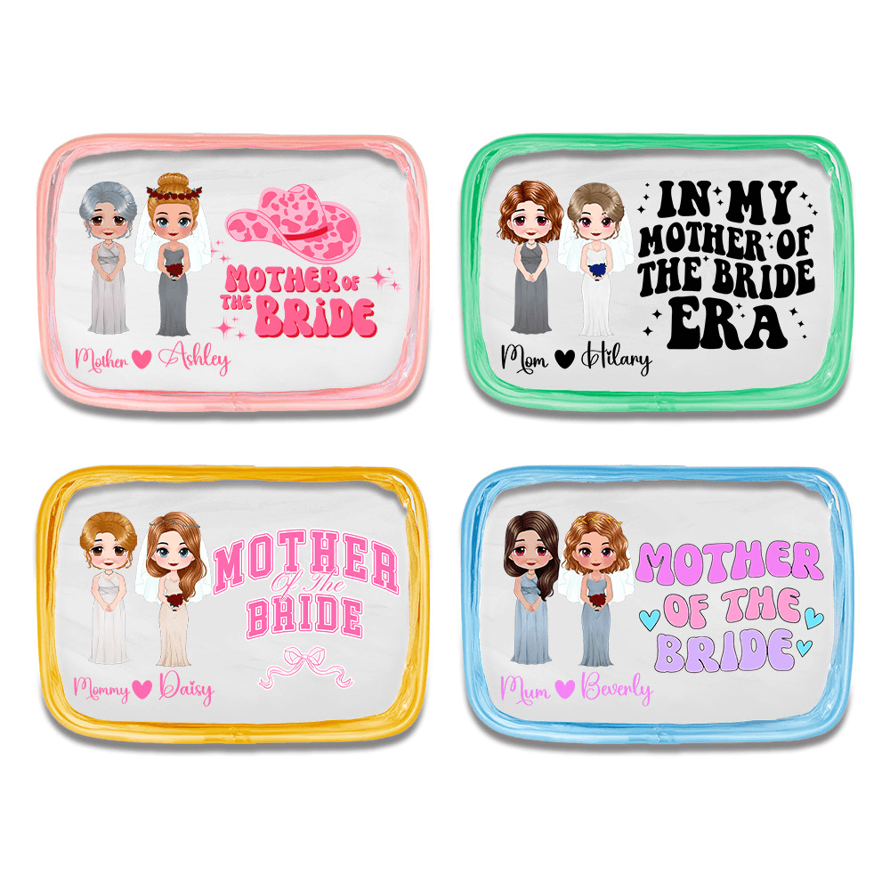 Personalized Cartoon Mother of the Bride Clipart Colorful Clear Makeup Bag with Name and 4 Designs, Travel Essentials, Wedding Gift for Mom